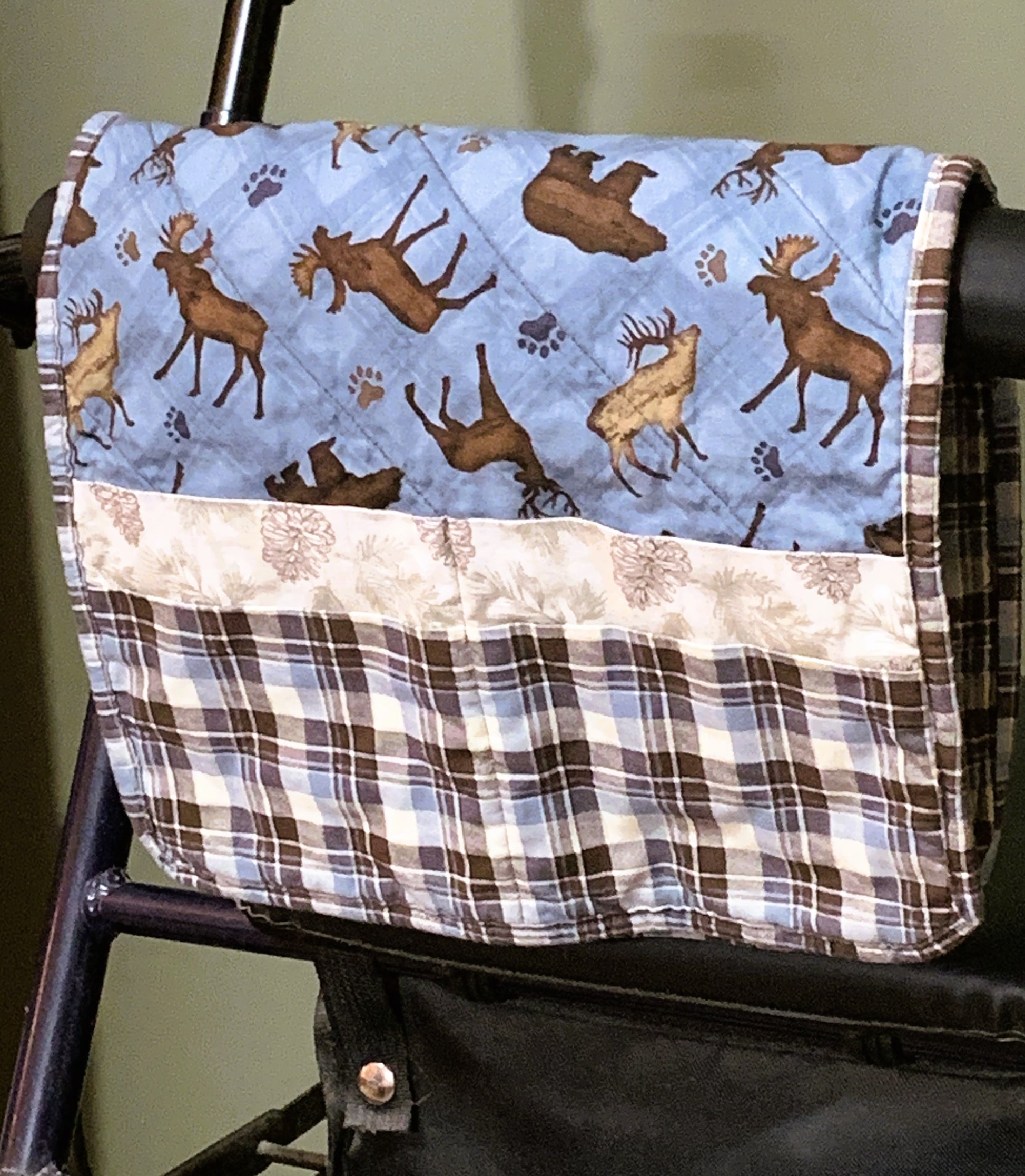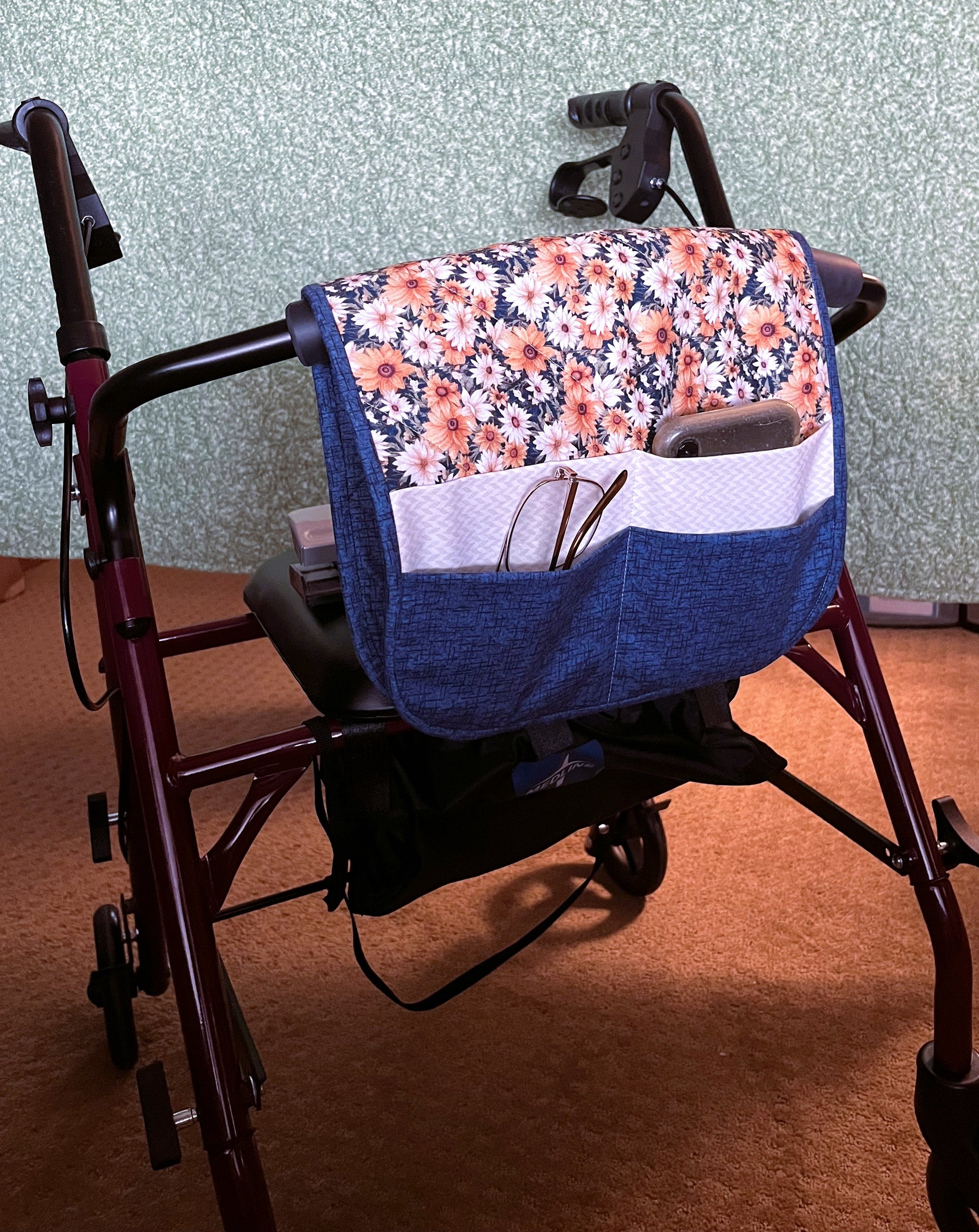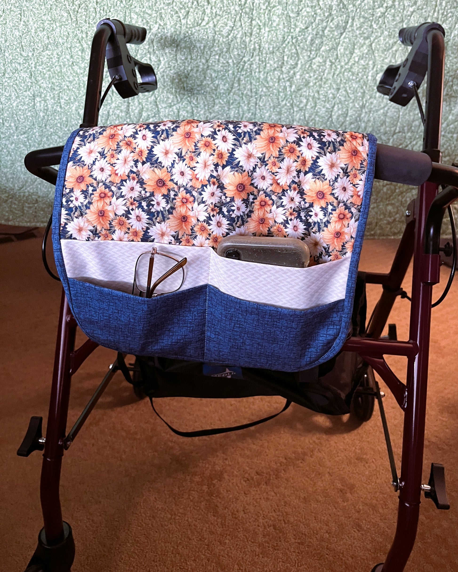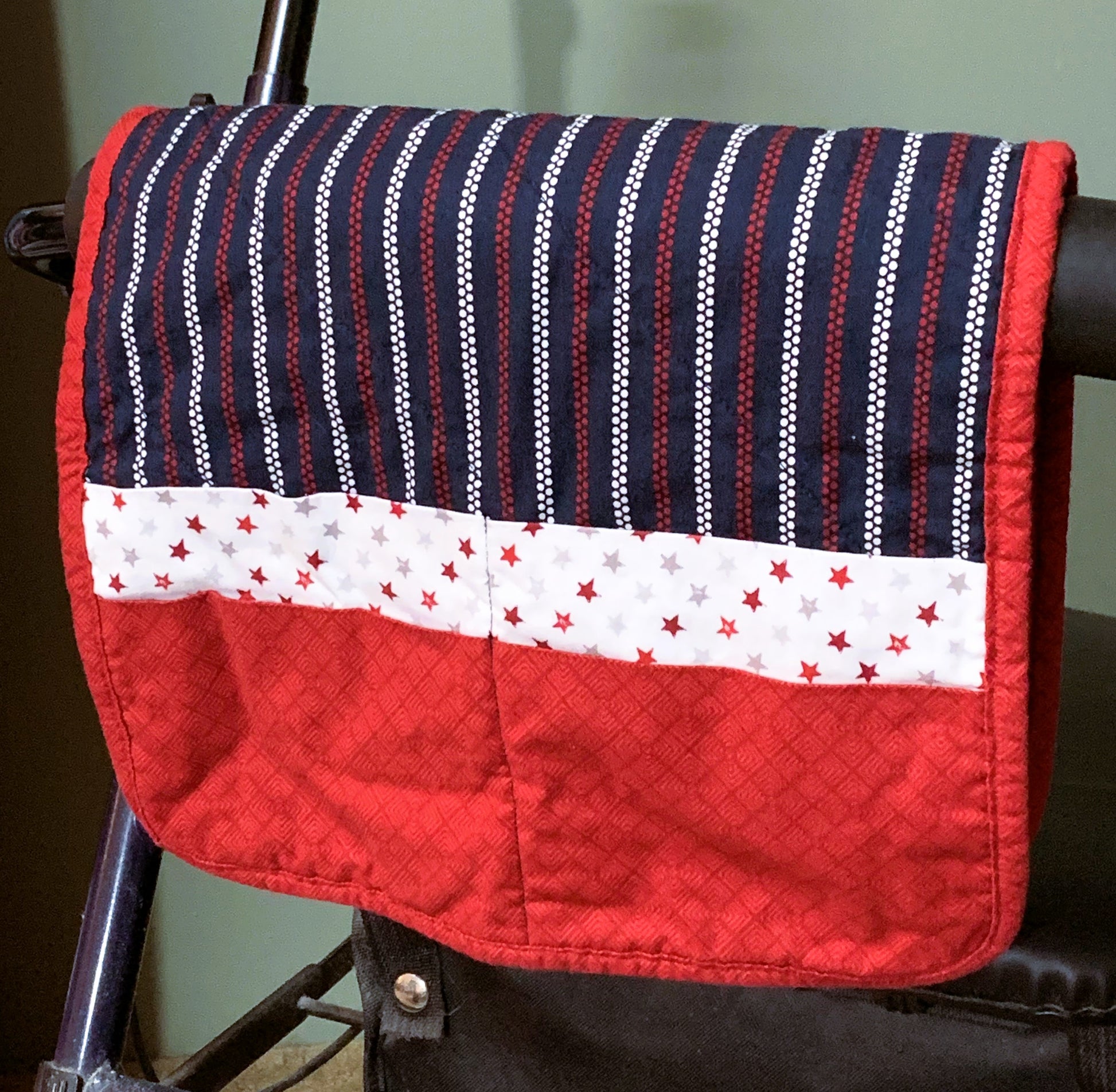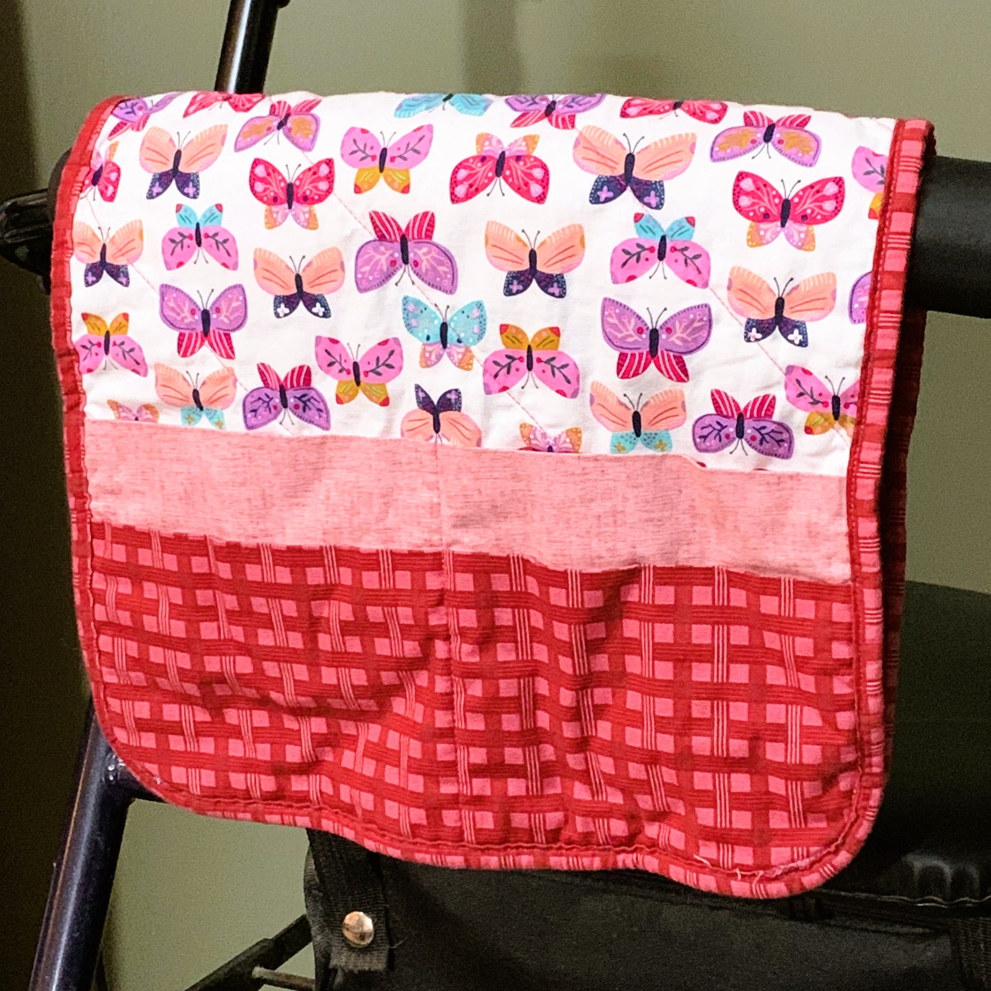 A handy way to carry small items while using a walker, this 100% cotton bag measures about 12 inches by 21 inches when laid flat (final measurement will vary slightly from product to product), and folds in half over the front bar of any walker. It has four pockets and velcro fasteners. Machine washable. Choose your color above.